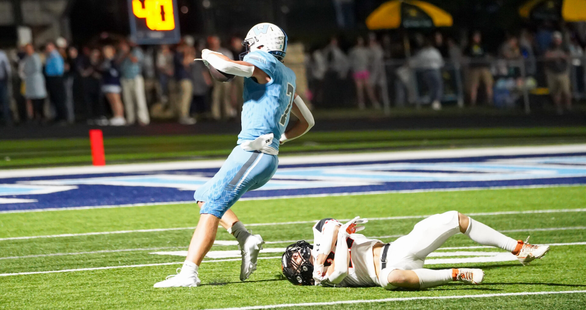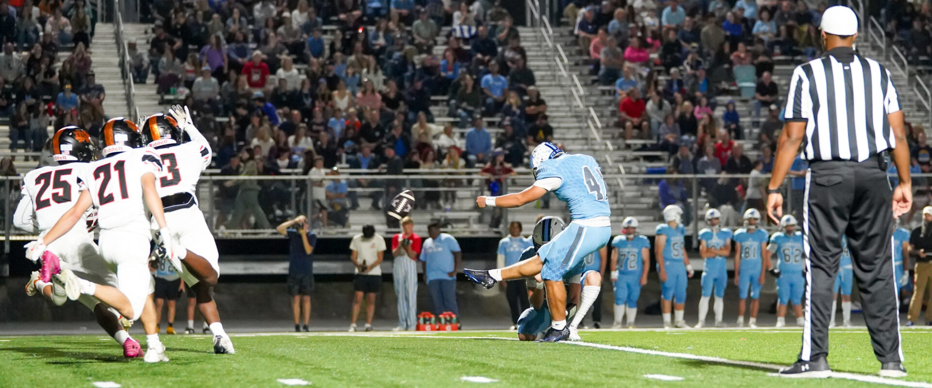 Late in the game with the outcome all but decided, backup QB Cade Keller took the reins of the offense in the 4th quarter and commanded a touchdown drive of his own. After North Davidson scored a second TD with just over a minute to go in the third quarter, Peays returned the kickoff 35 yards to to the Watauga 37. Three straight carries by Leon, each for three yards, put the Pioneers in a 4th and 1 situation at their own 46. Habich called three consecutive timeouts before the next play “to go for it,” with Leon rushing 6 yards for the first down. Keller & Co. made short work of the remaining 47 yards, featuring a cameo appearance by Thomas Dieters running the ball for an 8-yard gain and 13- and 27-yard keepers by the QB, the last one for a TD.