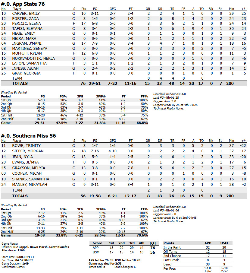 App State recorded 38 points by its reserves while holding Southern Miss to nine bench points. The Mountaineers also netted 17 second chance points compared to Southern Miss’ 11. App State limited Southern Miss to eight offensive rebounds and four fastbreak points. Over the course of play, App State and Southern Miss knotted the score on five occasions, swapping the lead six times.