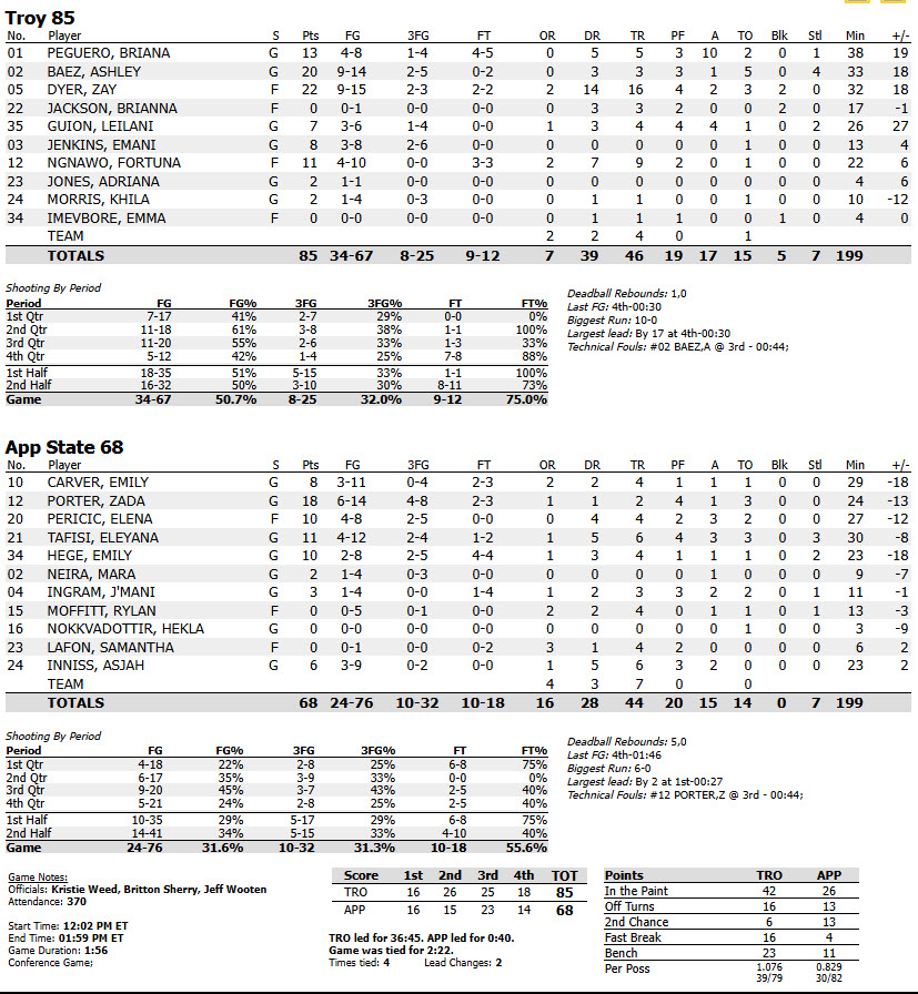 An 8-0 run by Troy to open the second period gave the visitors from Alabama a measure of momentum and they never gave it back. They led 42-31 at halftime, 67-54 at the end of the third quarter, and finished off the Mountaineers in the fourth quarter, outpointing App State, 18-14 in the final stanza to get to the eventual outcome.
