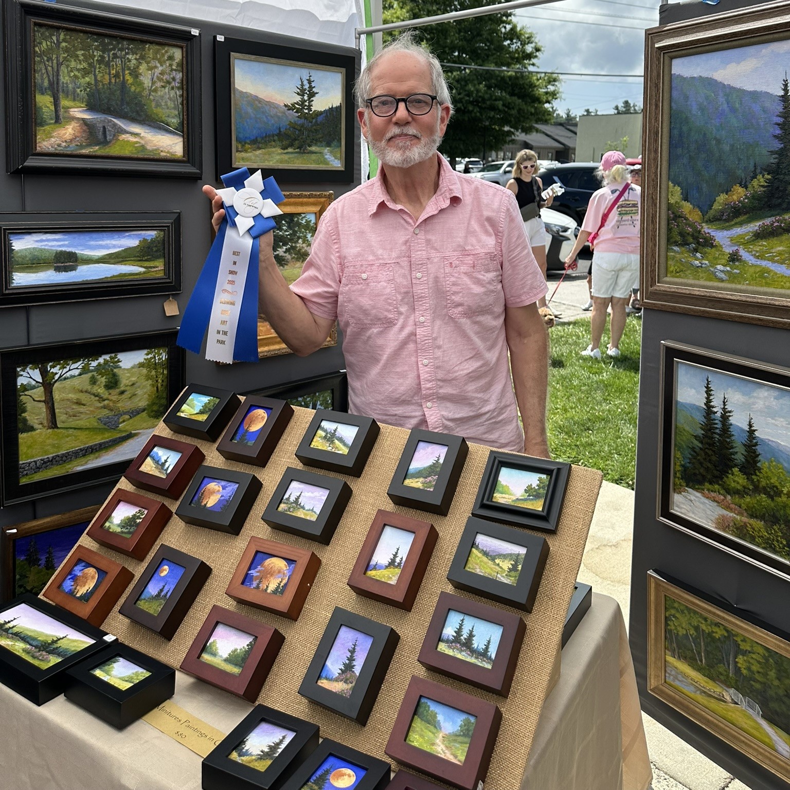 For the uninitiated, Art in the Park, staged monthly in Blowing Rock between May and October. Each month, 90 artists and artisans exhibit and sell their work, ranging from oils, photography, jewelry, sculpture, watercolors, leatherworking, woodworking, and more. It is a juried art show, with each artist having to meet certain standards established by the Blowing Rock Chamber of Commerce organizers. It is a different combination of visitors each month, with some overlap. The next dates are August 16, September 6, and October 4.
