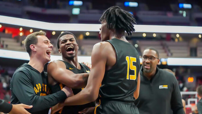 By David Rogers. LOUISVILLE, Ky. — Appalachian State men’s basketball led Louisville from start to finish — but a tenth of a second more time on the clock and the Mountaineers would have lost. App State survived the video review of what was initially ruled Louisville’s winning basket, the on-court decision reversed to the Mountaineers’ favor, 61-60.