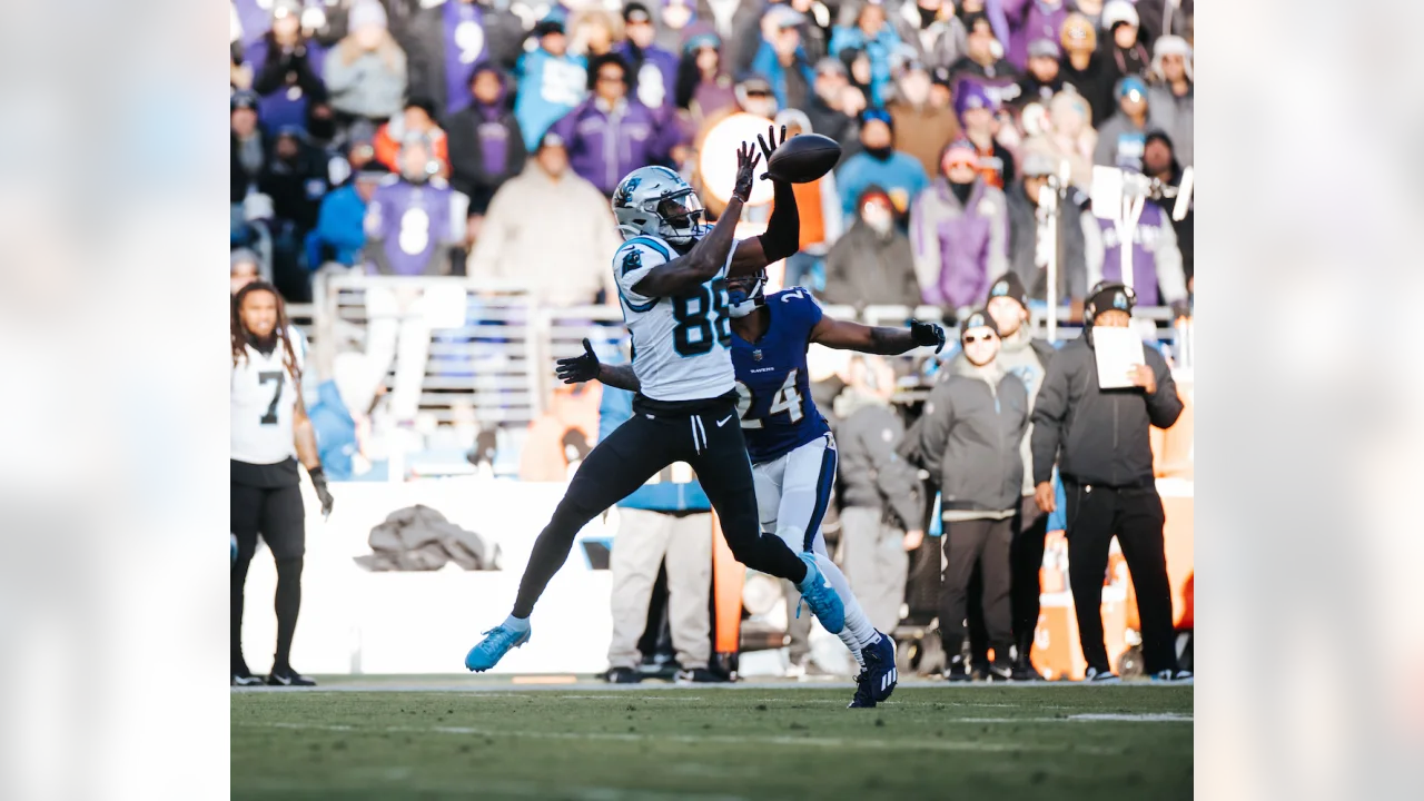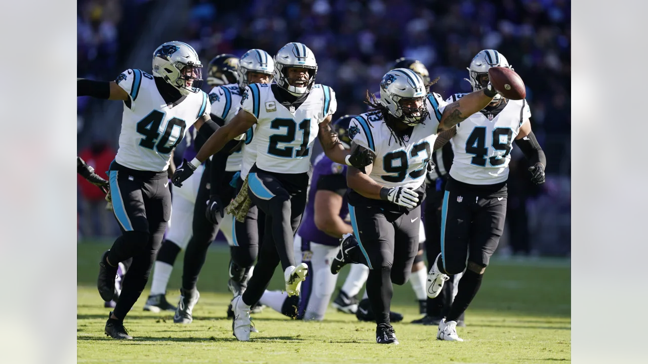 After exchanging 32-yard field goals — Baltimore’s Justin Tucker in the second quarter and Carolina’s Eddie Piniero in the third — the Ravens added a 37-yard field goal by Tucker early in the final stanza. Following Baltimore’s kickoff, on Carolina’s first play from scrimmage a Baker Mayfield pass to Shi Smith along the right sideline was completed, but the ball was ripped away by Ravens cornerback Marcus Peters. The call on the field by the game officials was that Smith was down before the ball came out, but a video review (after Baltimore head coach John Harbaugh challenged) reversed the call and that the Ravens recovered what was ruled a fumble.