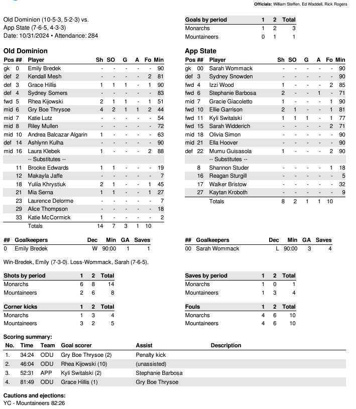 The Monarchs opened the scoring in the 35th minute of play. Mumu Guisasola attempted to clear the ball out of the App State goal box, but the ball bounced off her shoulder and upon review it was ruled a hand ball and a penalty kick. Gry Boe Thrysoe converted the penalty kick, placing it perfectly to the bottom right corner.