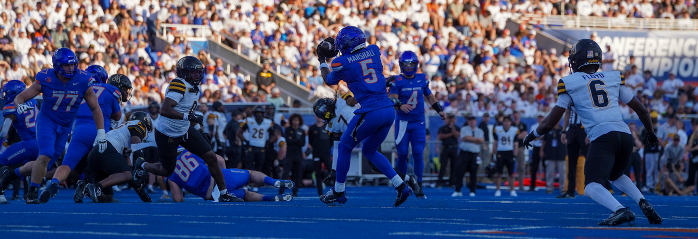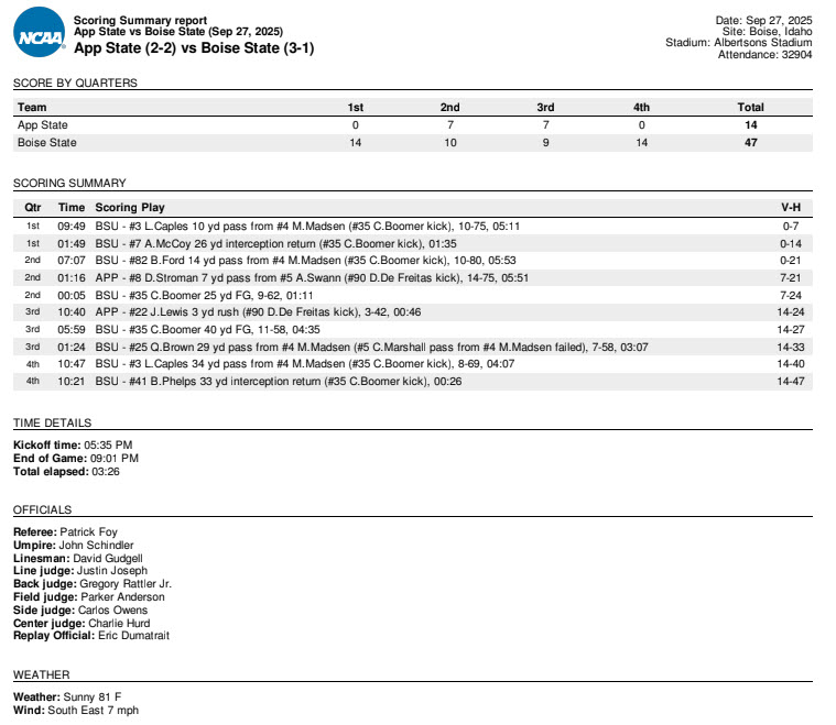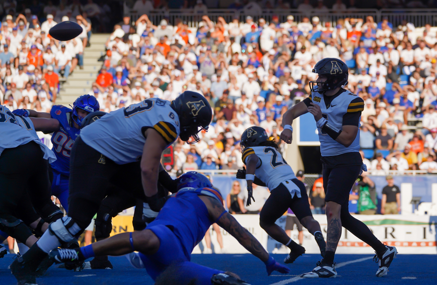 By David Rogers. BOISE, Idaho (remote) — At least Appalachian State didn’t commit turnovers in the red zone during its game against Mountain West Conference frontrunner, Boise State, on Sept. 27 (like it did on Sept. 13, at Southern Miss.). And yet, there were still plenty of self-inflicted wounds to help explain a lopsided, 47-14 win by the host Broncos.