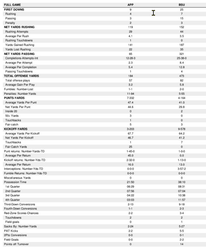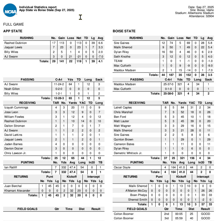 Whether on offense or defense, applying pressure is a relevant difference maker in just about any sport, especially in football. The Broncos limited App State’s offense to just 174 total yards, well below the 586 total yards the Mountaineers rolled up in the opening win vs. Charlotte, the 503 total yards in the win No. 2 vs. Lindenwood, and even the 470 yards gained in the loss to Southern Miss. Besides the four takeaways (one fumble and three pass interceptions), Boise State also recorded five quarterback sacks, five QB “hurries,” and five tackles for loss.