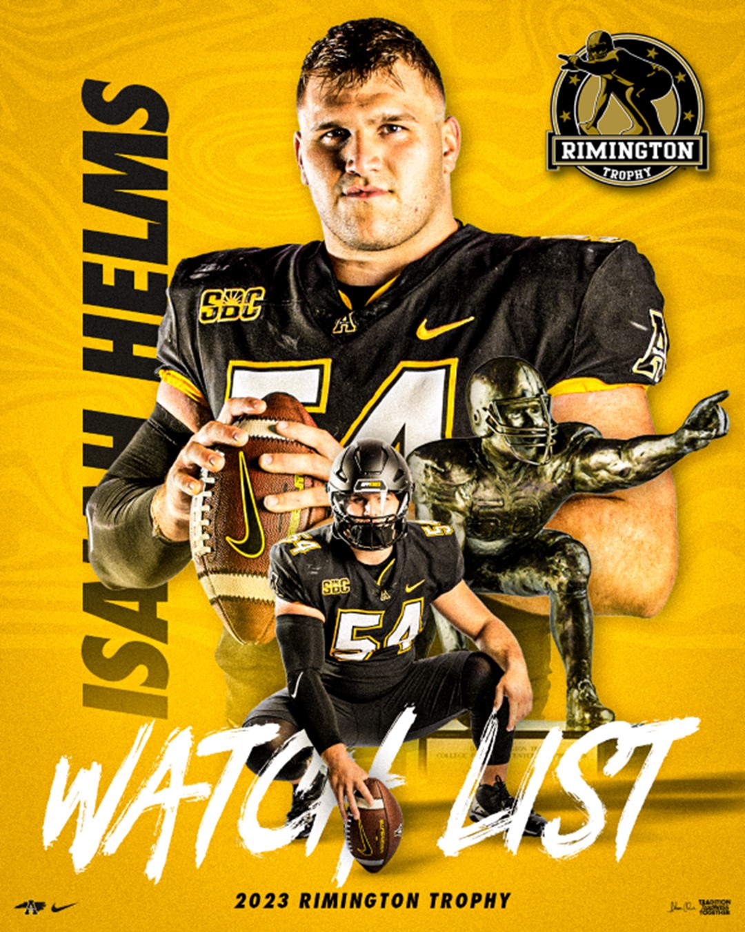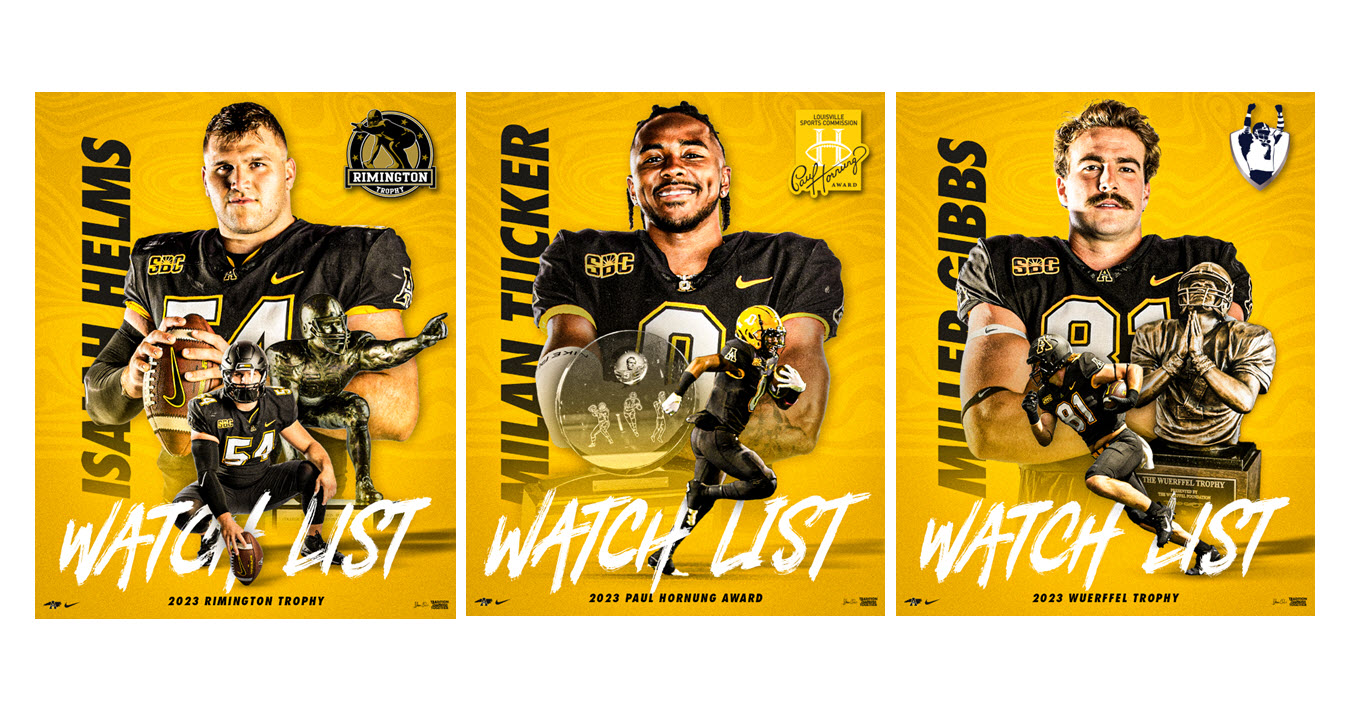 By David Rogers. BOONE, N.C. — Three more Appalachian State football players garnered national attention this week by being named to preseason “watch lists” for individual awards. The trio includes Isaiah Helms for the Rimington Trophy, which goes to the nation’s top center; Milan Tucker for the Paul Hornung Award, given annually to the most versatile FBS-level player in the country; and tight end Miller Gibbs, for the Wuerffel Trophy, recognizing the FBS player who best combines exemplary community service with leadership achievement on and off the field.