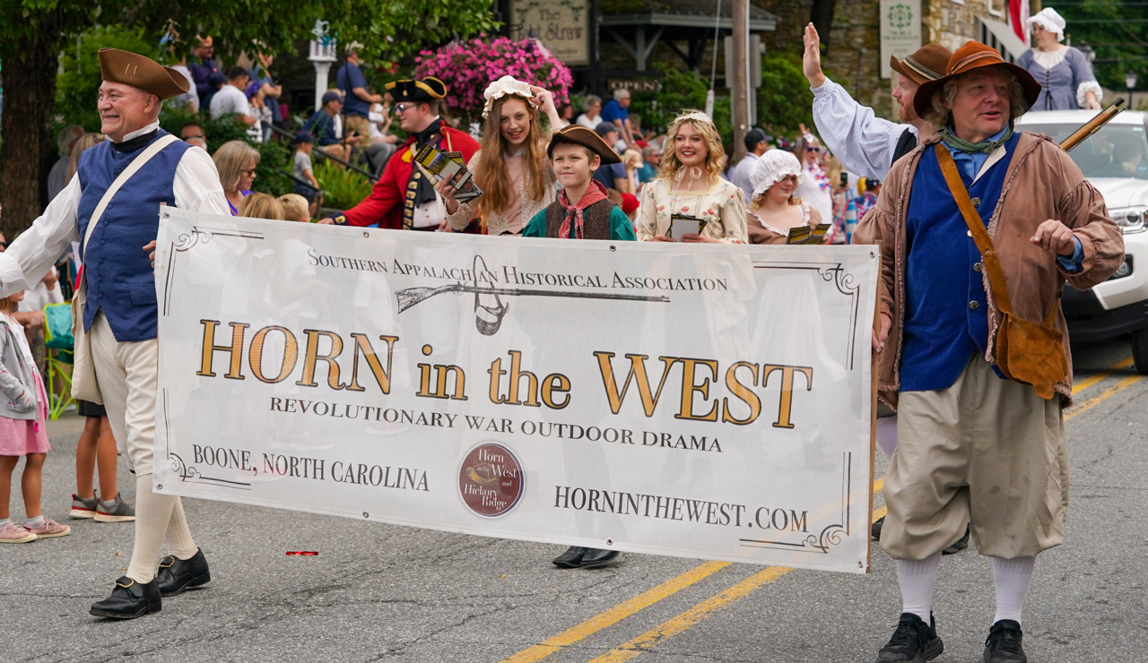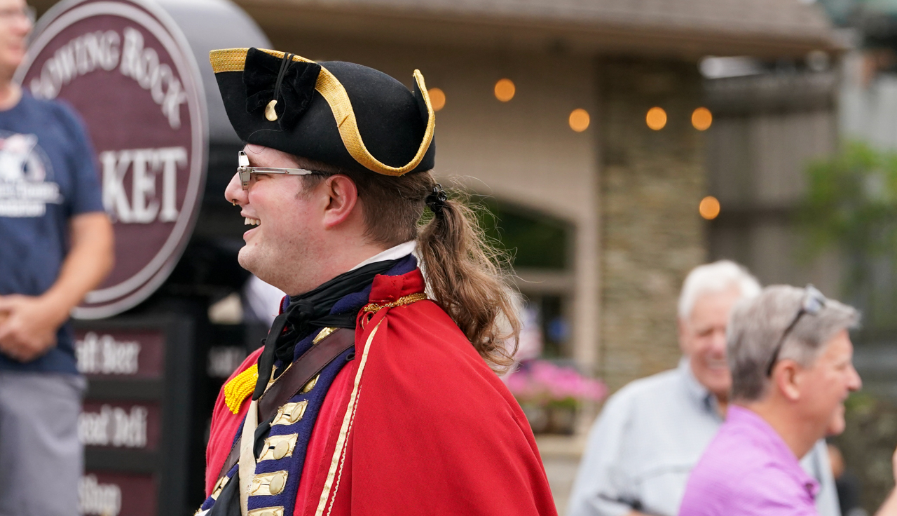 The redcoats are coming! The redcoats are coming! Is the nose ring standard issue in the 1776 British Army?Past president of the Blowing Rock Chamber of Commerce, Ronnie Marks of Shoppes on the Parkway lent a hand on July 1 in introducing the Chamber’s 4th of July Parade entry.