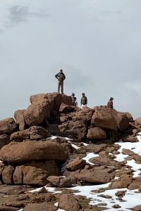 “The lightning storm was actually a hailstorm,” Cutlip recalled. “We knew it was coming. We could see it, miles away, making its way toward us. We prepared ourselves for it. It first came with rain, which became a major hailstorm. There were lightning strikes all around us and we implemented our lightning protocol, not going further up the mountain. We were soaking wet, waiting it out for two hours. We had to take precautions not to get hypothermia. All of us were close to that, so we had to do our best to keep warm. The temperature had dropped, dramatically, from the upper 80s when we started at the bottom, but when the storm hit, it was in the low 50s. We were soaking wet and there was a slight wind, which made it even chillier.”