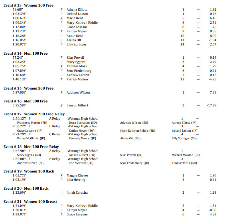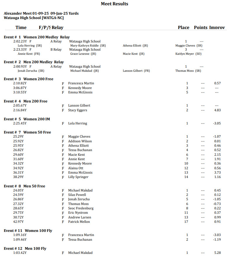 By David Rogers. TAYLORSVILLE, N.C. — A strong performance by Watauga High School’s swim teams produced a 4-team sweep for the women’s team and a 3-1 performance for the men in a Jan. 9 meet hosted by Alexander Central. The other teams included Wilkes Central, West Wilkes, North Wilkes, as well as Alexander Central.