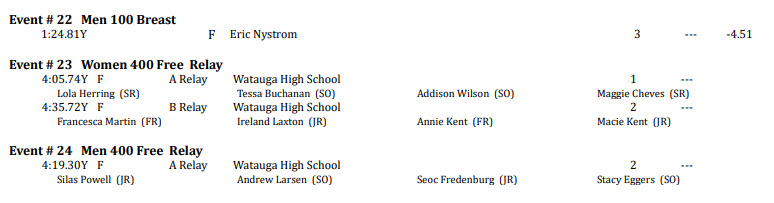 - Women’s 400 Free Relay (Lola Herring, Tessa Buchanan, Addison Wilson, Maggie Cheves)