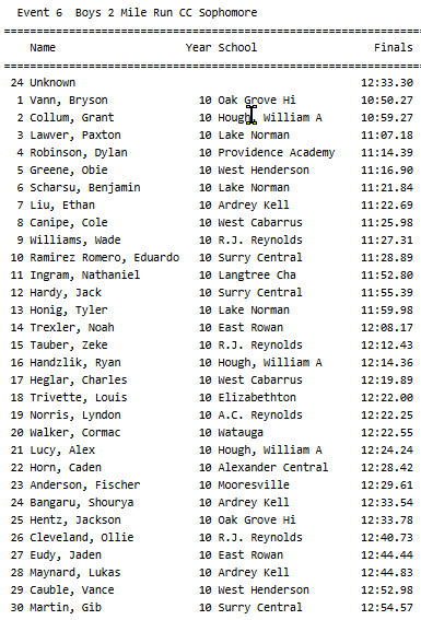 With a stirring “kick” in the last 100 yards, Oak Grove’s Bryson Vann captured the No. 1 title in the 10th Grade Men’s division, crossing the line in 10:50.27. He was followed by No. 2 Grant Collum (10:59.27, William A. Hough HS), No. 3 Paxton Lawver (11:07.18, Lake Norman HS), No. 4 Dylan Robinson (11:14.39, Providence Academy), and No. 5 Obie Greene (11:16.90, West Henderson).