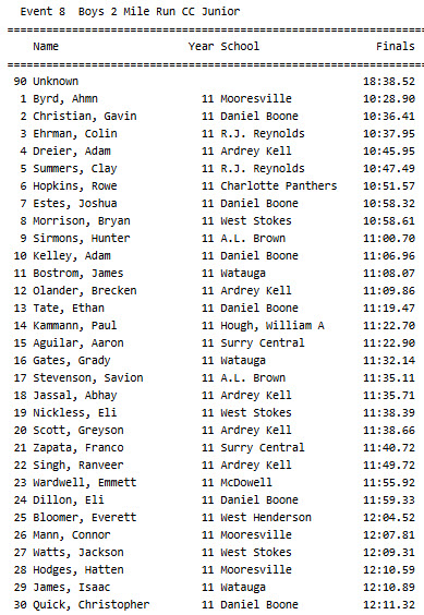 Ninety (90) student athletes competed in the division, with James Bostrom (No. 11, 11:08.07) and Grady Gates (No. 16, 11:32.14) were the top Watauga finishers.