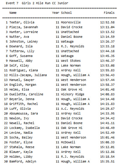 The race leaders were No. 1 Olivia Teeter of Mooresville (12:52.58), No. 2 Savannah Piazza of David Crockett HS (13:11.04), No. 3 Lorraine Hunter (unattached, 13:13.52), and No. 4 Ava Nutter of Daniel Boone HS (13:14.59).