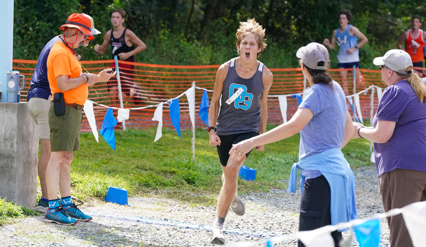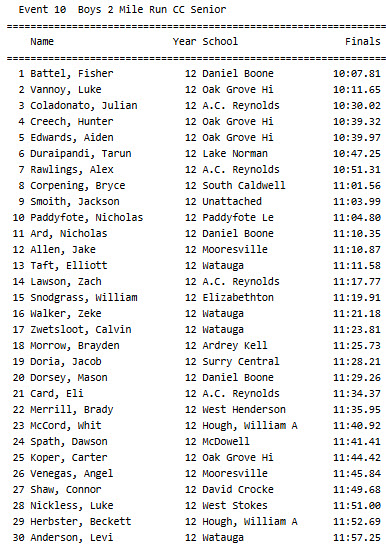 Daniel Boone HS’s Fisher Battel crossed the line No. 1 in the day’s final race, completing the course in 10:07.81, the fastest performance of the day. He was followed by Luke Vannoy (No. 2, 10:11.65, Oak Grove HS), Julian Coladonato (No. 3, 10:30.02, A C Reynolds HS), Hunter Creech (No. 4, 10:39.32, Oak Grove HS) and Aiden Edwards (No. 5, 10:39.97, Oak Grove HS).