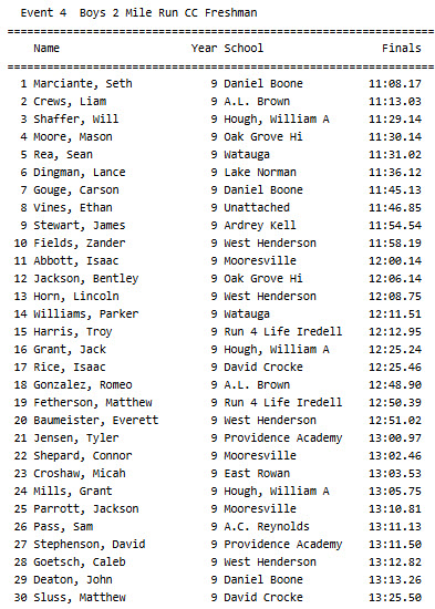 Watauga freshman Sean Rea was the first Pioneer to cross the line at No. 5, after Seth Marciante (No. 1, 11:08.17, Daniel Boone HS), Liam Crews (No. 2, 11:13.03, A.L. Brown HS), Will Shaffer (No. 3, 11:29.14, William A. Hough HS) and Mason Moore (No. 4, 11:30.14, Oak Grove HS). At No. 5, Rea finished in 11:31.02)