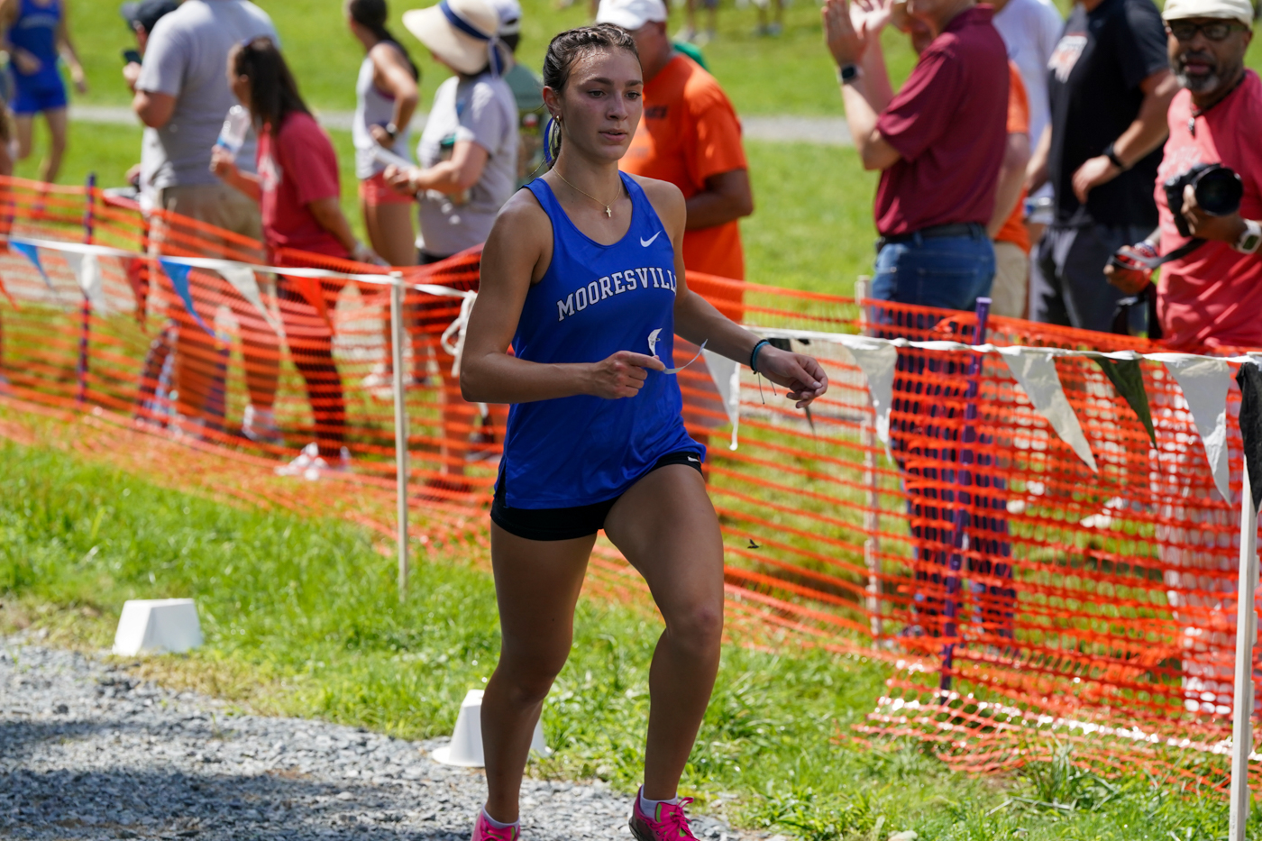 Asked about the Watauga course, she said, “It is beautiful up here. There are a lot of terrain changes, from uneven grass and gravel to pavement and a gravel finish. I’m glad I wore my spikes.”