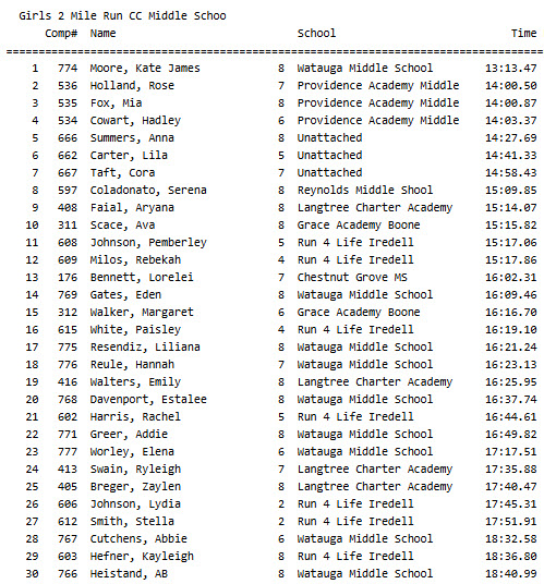 Watauga 8th grader Kate James Moore ran away with the race, crossing the finish line more than 46 seconds ahead of a trio of athletes from Providence Academy in Rose Holland, Mia Fox and Hadley Cowert. Another trio of runners, all unattached, were across the line next, including Anna Summers, Lila Carter, and Cora Taft.