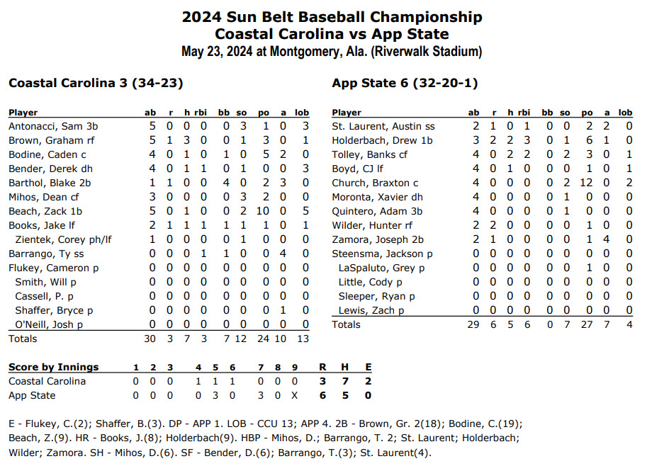 By Matt Present. MONTGOMERY, Ala. — Cody Little escaped a bases-loaded jam in the top of the seventh inning and Drew Holderbach followed with a go-ahead three-run homer in the bottom half of the frame, lifting sixth-seeded App State to a 6-3 win over seventh-seeded Coastal Carolina at Riverwalk Stadium.
