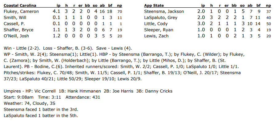 Little allowed just one run on two hits, striking out three, and despite loading the bases, with the tying run 90 feet away in the top of the seventh, picked up a strikeout to keep the score tied at 3-3. App State pitching fanned 12 batters in the ballgame and stranded 13 Coastal base runners.