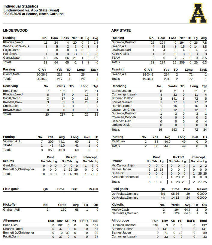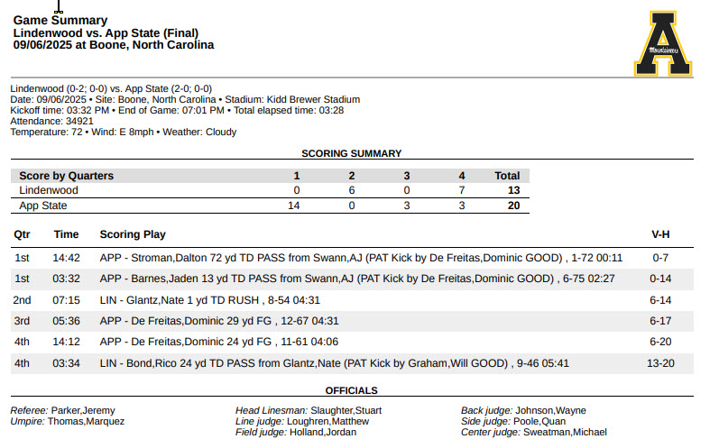 After a 74-yard touchdown pass from redshirt junior QB AJ Swann to redshirt senior wide receiver Dalton Stroman on the first play of the football game, App State fell mostly flat, clearly not living up to expectations in a 20-13 win over a tiny FCS opponent in Lindenwood, the St. Charles, Mo. school with an enrollment of just 7,500 and recently elevated from NCAA Division II to the Football Championship Subdivision (FCS) of NCAA Division I.