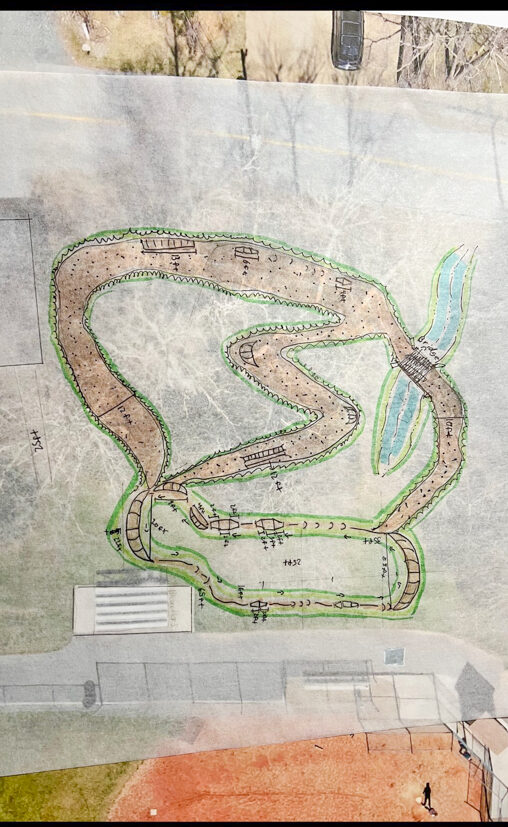 In young Cutlip’s plan, much of the overgrown conditions will be eliminated and dead limbs and branches removed. Added will be a 5-10 feet wide pump track complex of what extreme sports enthusiasts call “berms,” “rollers,” and various “obstacles.” Small bridges are planned for the riders to traverse over a small creek and existing stormwater drainage areas.