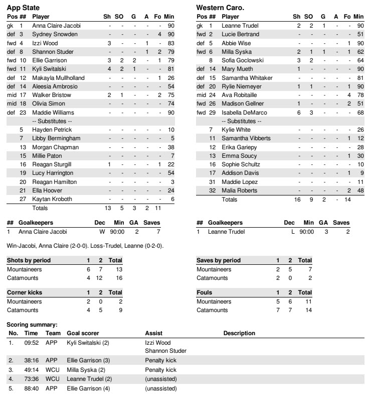 Garrison’s game-winning goal came with 69 seconds to play. Anna Claire Jacobi began the play with a goal kick. Garrison, from midfield, headed the ball to Switalski on the left wing. The redshirt sophomore from High Point, N.C., dribbled into the Catamount end and crossed the ball into the box where Wood was waiting. A Western Carolina defender slide-tackled the ball away from Wood, but Garrison was able to win the footrace — and win the game for App State.