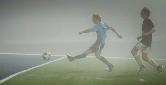 A half moon shone eerily across the field in the first half but even it became invisible as incoming fog hung over the stadium lights at intermission before descending down to envelop the playing surface. Only the keenest eyes could see any of the action occurring on an opposite sideline. Even then, there were startled shouts erupting as a ball would come into view. It was a night for fog-piercing glasses — or Ghostbusters — to be sure.