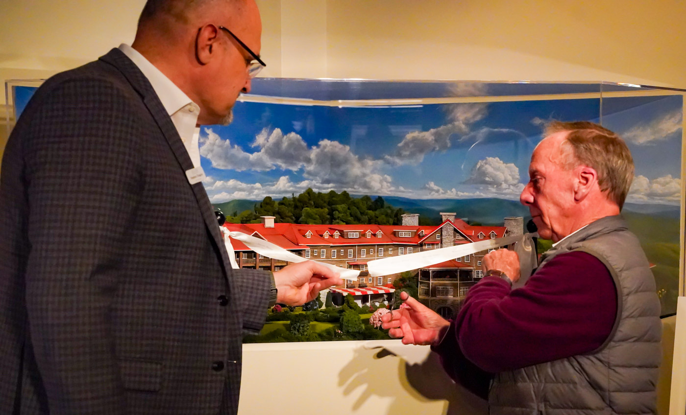 Officially, the exhibit opened on Saturday, Nov. 16, but several museum patrons and local dignitaries were on hand for the ribbon-cutting ceremony featuring the immersive exhibition that celebrates the town’s rich history. Along with an historical timeline circling the room that details the village’s founding and development, a postcard desk from which visitors can write loved ones, and pieces of Blowing Rock’s history, including artifacts and signage, the “centerpiece” of the exhibit is actually in the back corner: a 1:87 scale diorama of the famed Mayview Manor Hotel.
