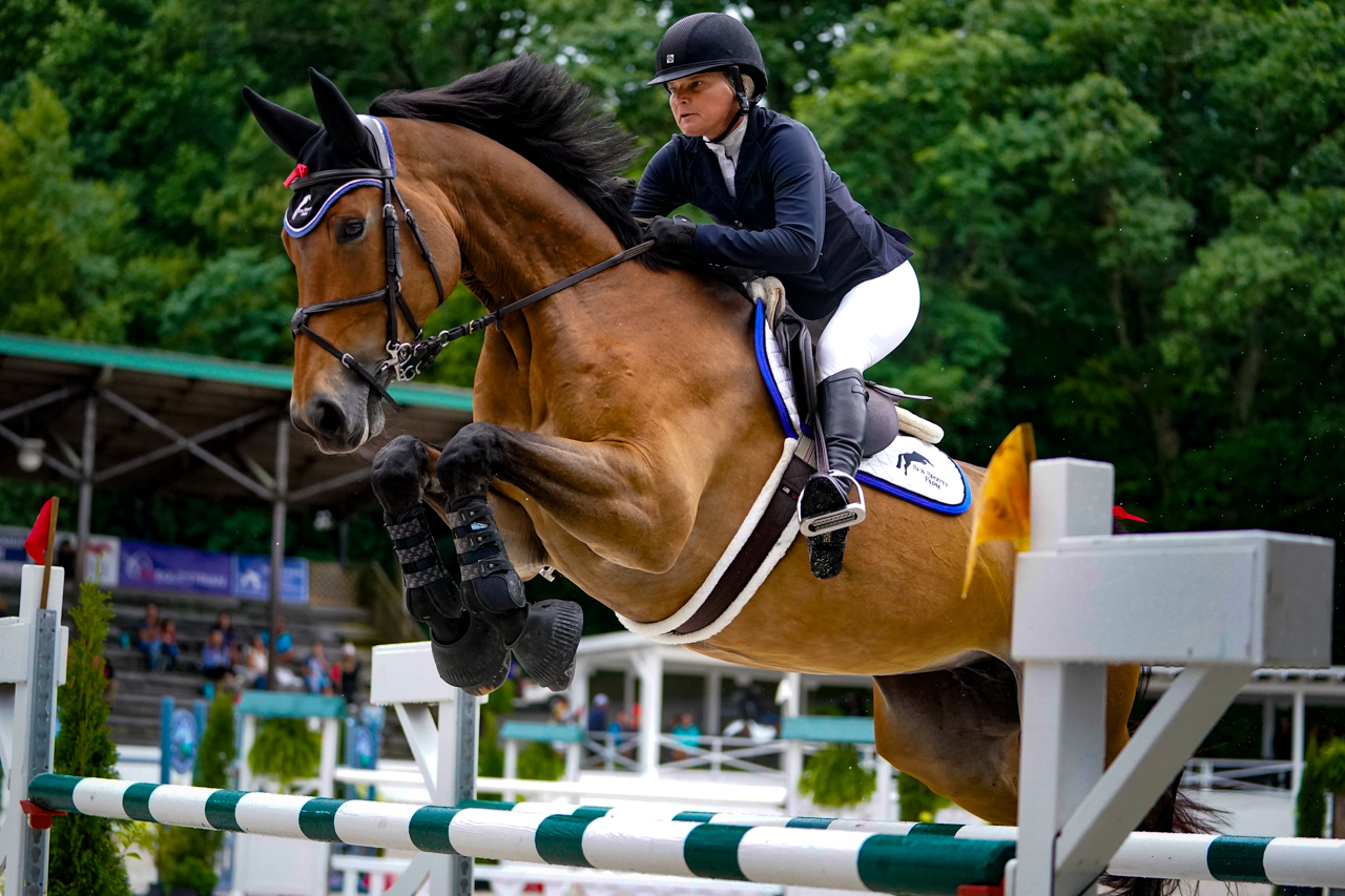 Elizabeth Cram of Aiken, S.C., riding HF Jett, set the bar high when she was first to ride in the jump-off, beating the the allowed time by six seconds, making the final jump after she guided Jett around the course cleanly, in 42 seconds.