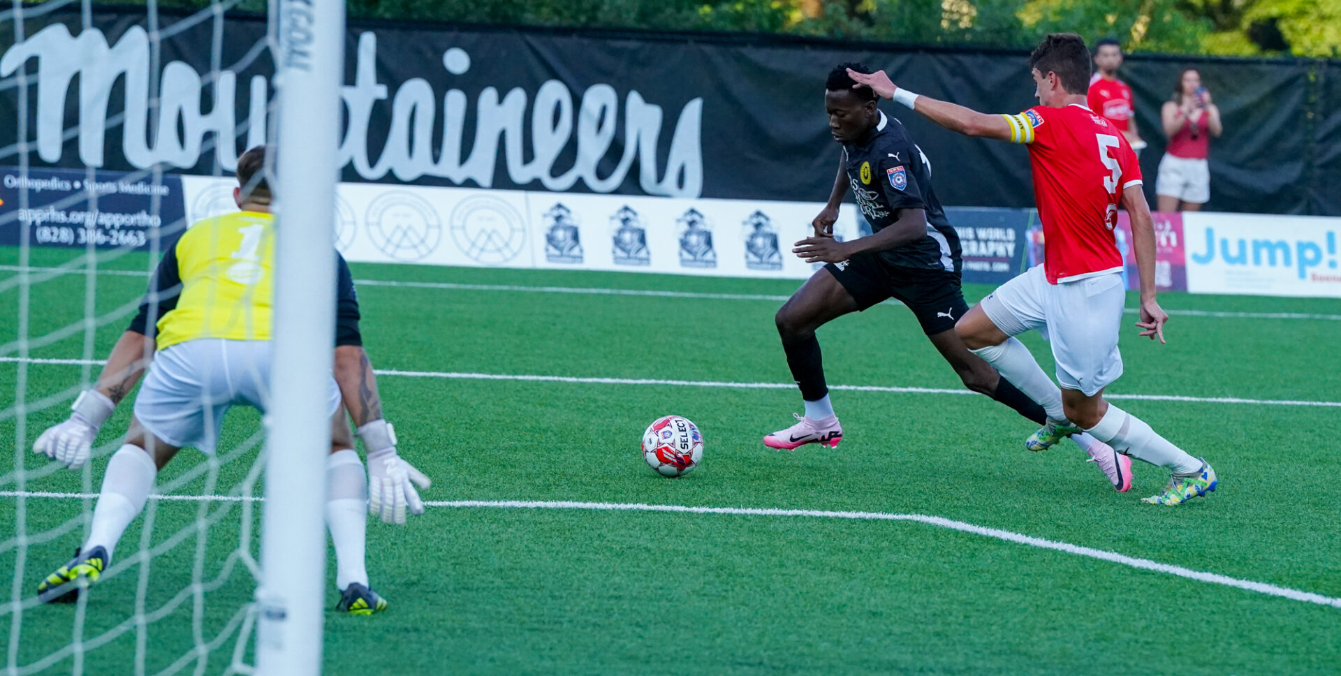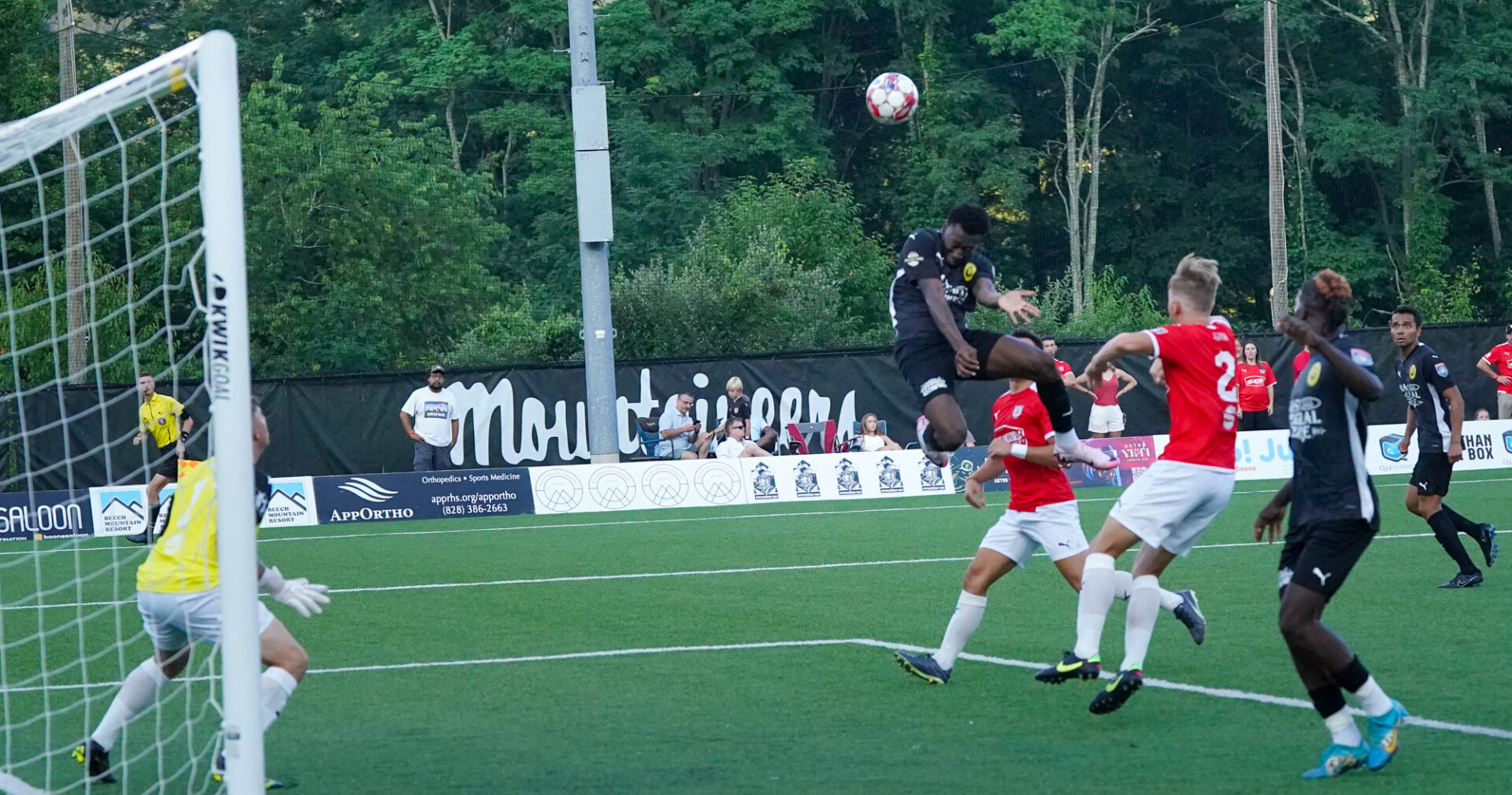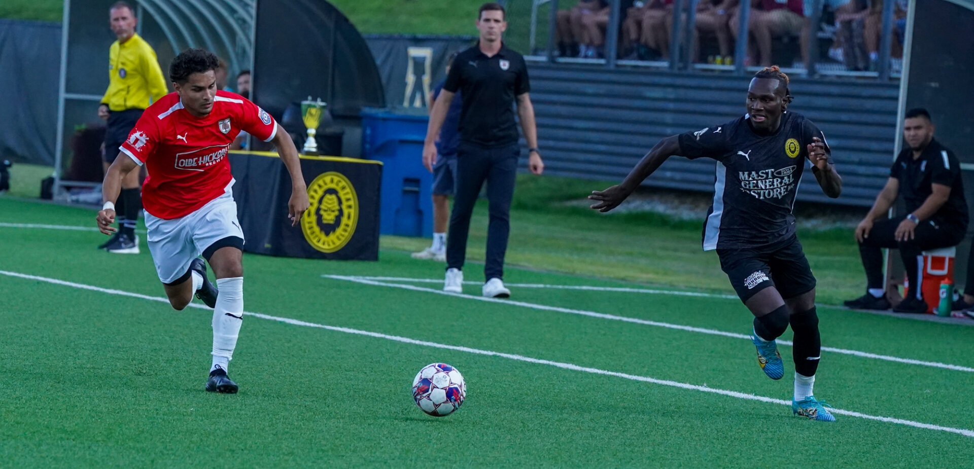In front of the season’s largest crowd filling the grandstands and on the surrounding ridges, with drums banging and chants echoing across the playing field relentlessly, the first half was scoreless until the 39th minute when Hickory’s John Osadolor capitalized on an Appalachian defender’s miscue and zipped the ball past the Sasquatch goalkeeper to take a still nervous, 1-0 lead into the intermission.