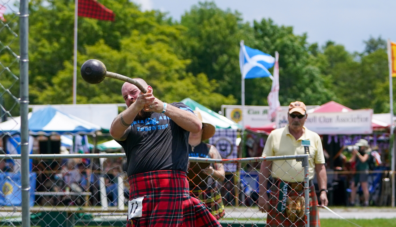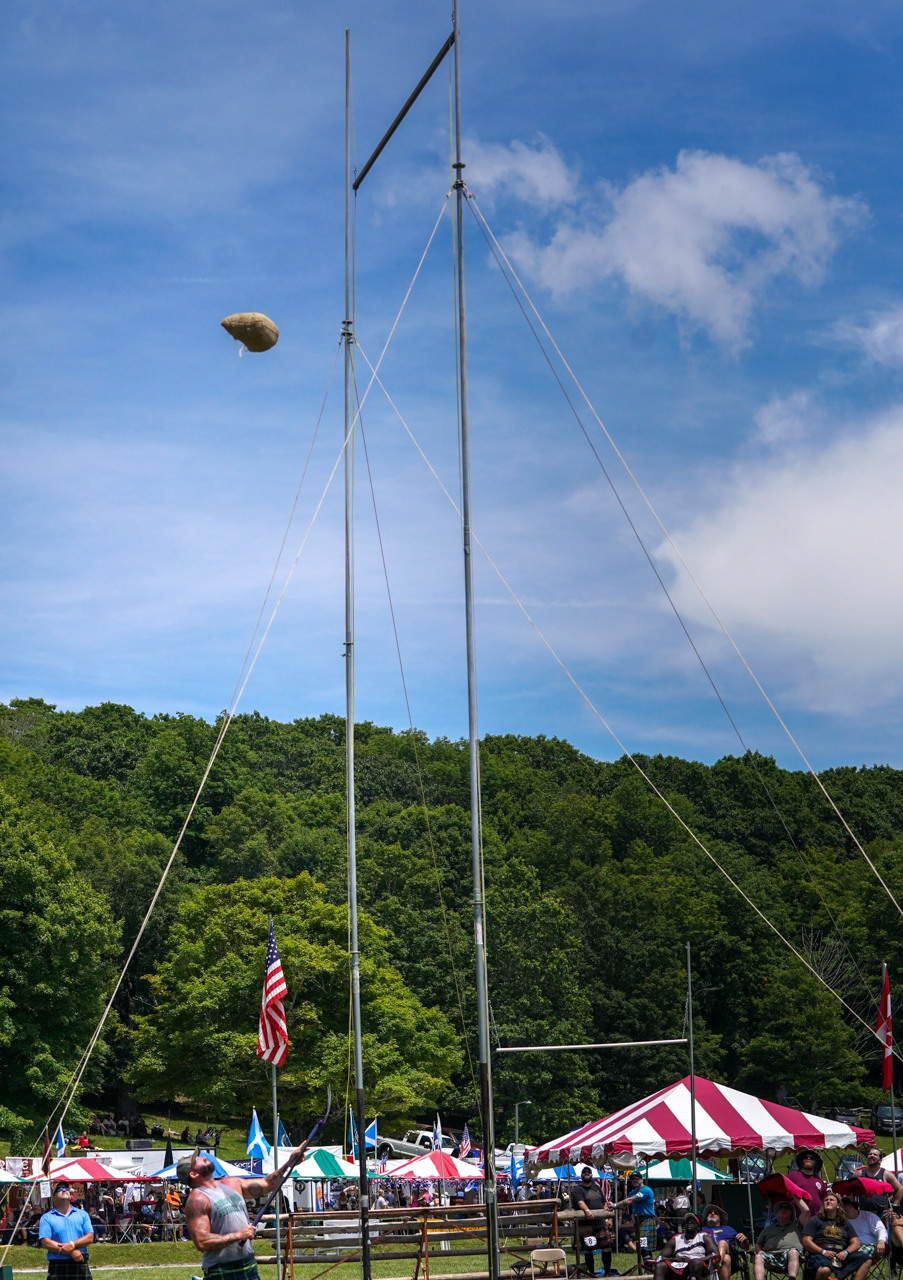 In the amateur division of the sheaf toss held on July 7, Ross Alewine of Clemson, S.C. made a case for potentially moving up after tossing the burlap bag filled with straw over a horizontal bar 33 feet in the air. Prior to the competition, Alewine’s personal record was 28 feet. The world record for the #20 sheaf toss is just over 37 feet, set by Spencer Tyler at the Chicago Highland Games on June 15, 2019 (Tyler broke his own record, set in February of 2019, at the Queen Mary Highland Games in Long Beach, Calif.