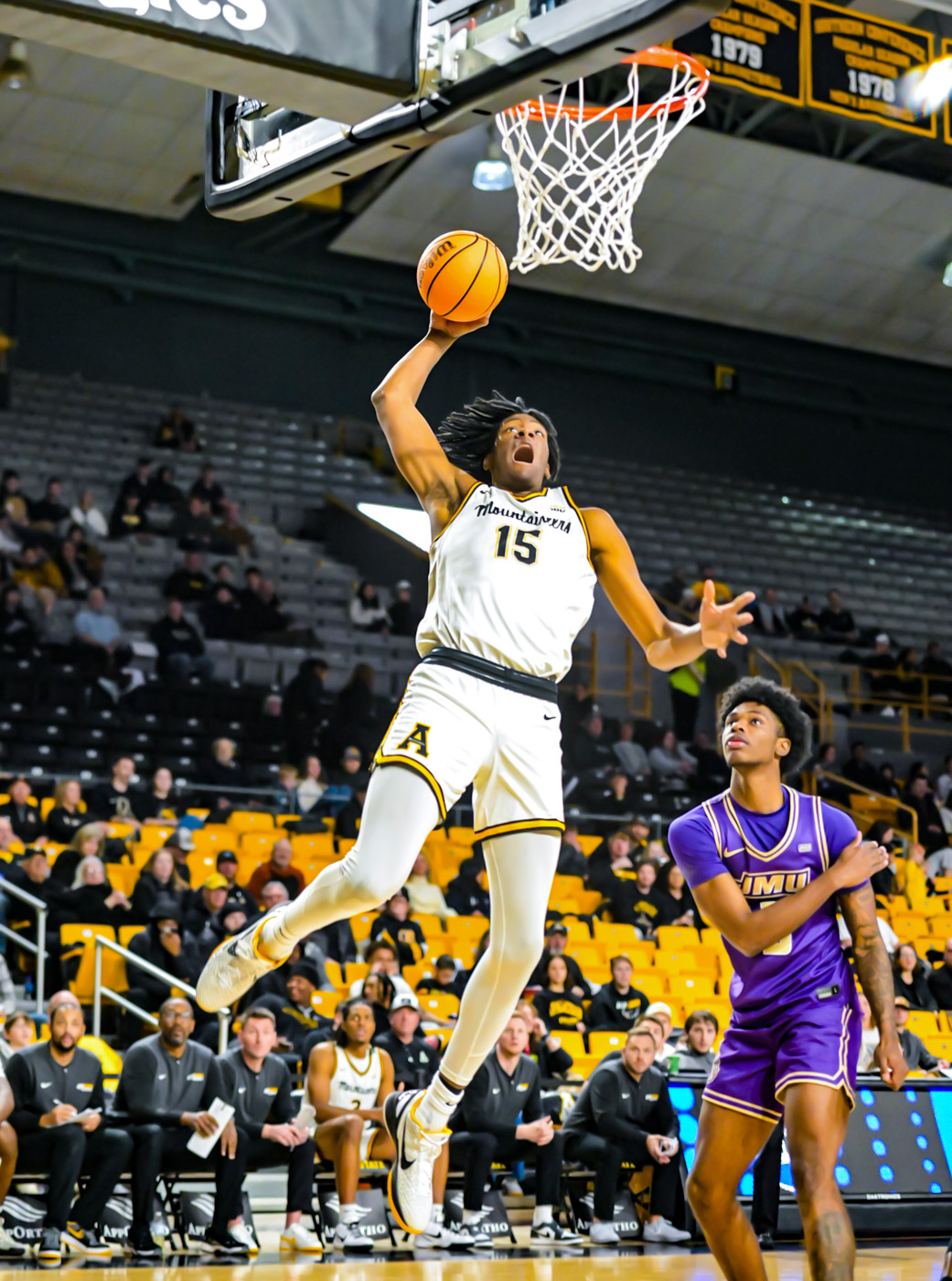 Thanks largely to the Dukes’ turnovers (10 in the first half alone), the Mountaineers gained early momentum, including separation on the scoreboard midway through the opening half, but it was an 11-0 run just before intermission that arguably drove a dagger into the hearts of the visitors. The scoring burst, capped by a 3-pointer by CJ Huntley just 10 seconds ahead of the buzzer sent App State into their locker room at halftime with a commanding, 49-30 lead.