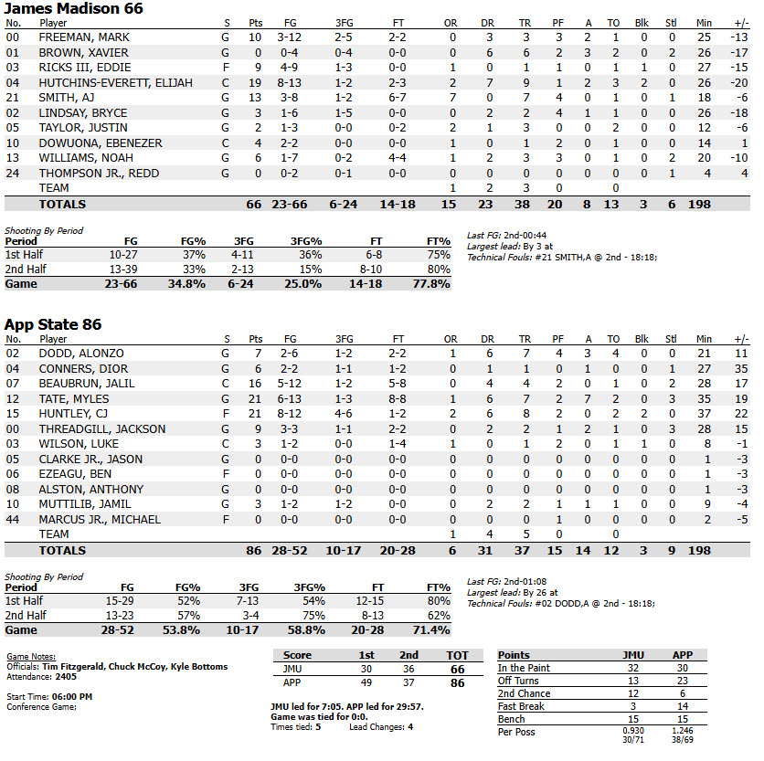 By David Rogers. BOONE, N.C. — Visiting James Madison men’s basketball became their own worst enemy on Jan. 11 at the Holmes Convocation Center — and App State took advantage in carving out a dominating, 86-66 victory in front of 2,405.