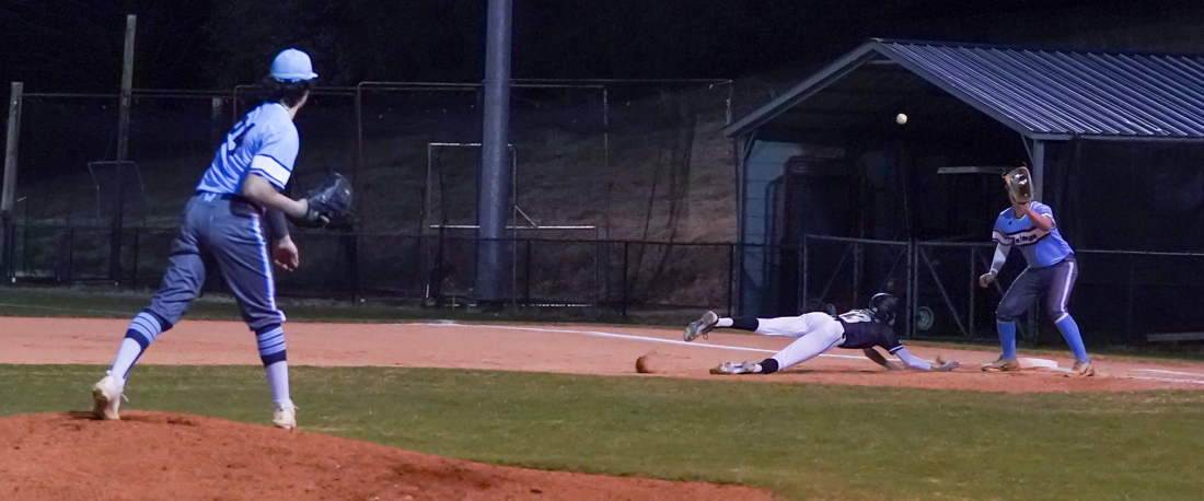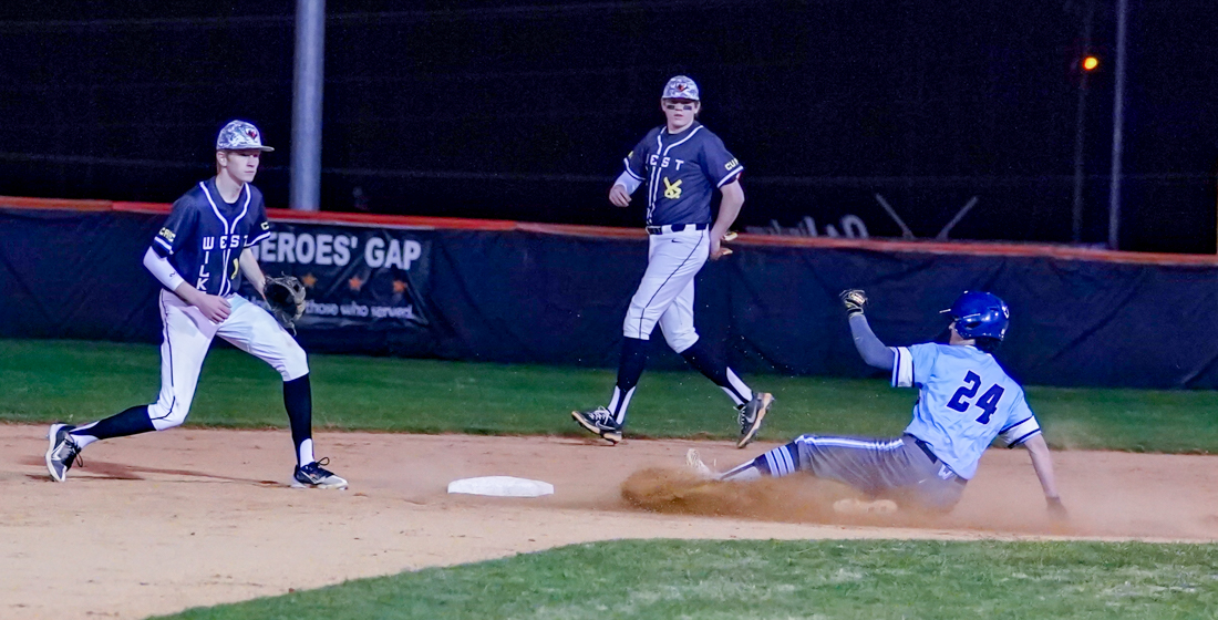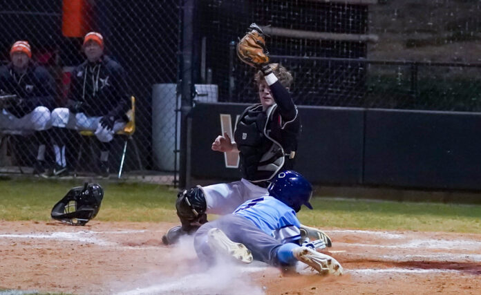 It didn’t take long for Greene to take advantage of a runner on third with second base empty. On a 1-1 count with Jacob Dilley at bat, Greene stole second easily. Perhaps the Blackhawks’ starting pitcher, Carson Edmiston was a bit rattled by the activity, but a wild pitch on a 2-1 count sent Hodges to the plate, sliding head first with the dirt flying around him and West Wilkes catcher, Eli Johnson — and under the versatile freshman’s tag attempt. Greene took third on the play but was left stranded when Dilley grounded out to second. The damage had been done, however, with Watauga leading, 4-1.