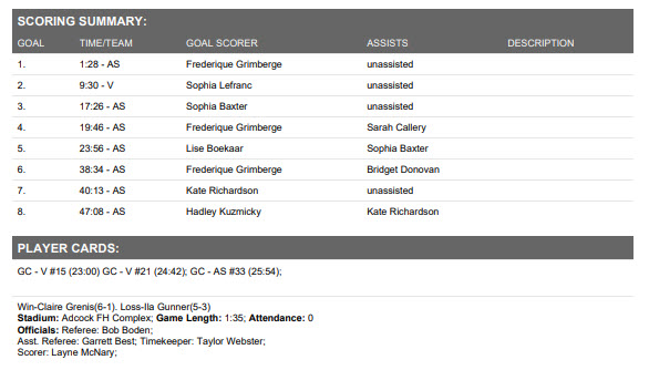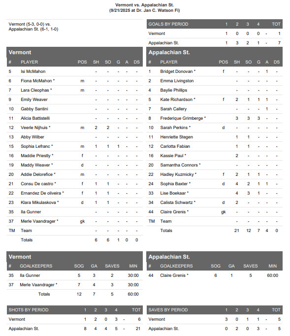 Sophia Baxter, Lise Boekaar, Frederique Grimbergen, Hadley Kuzmicky and Kate Richardson all scored against the Catamounts (5-3), with Grimbergen netting a hat trick.