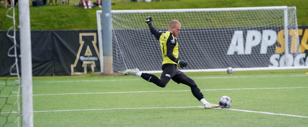 Barely two minutes into the extended play, Appalachian’s attacker Michael Eberle found himself with the ball some 10 yards outside the left goalpost and roughly seven yards inside the field of play. He sent the ball whizzing across the face of the goal, past the goalkeeper where it was met, perfectly timed, by the foot of defender Alex Render, who had moved up into the fray just outside the right post. In a word, Render pummeled the ball past Palacios, who had little or no chance to react before Render’s rocket nearly tore a hole in the back of the net.