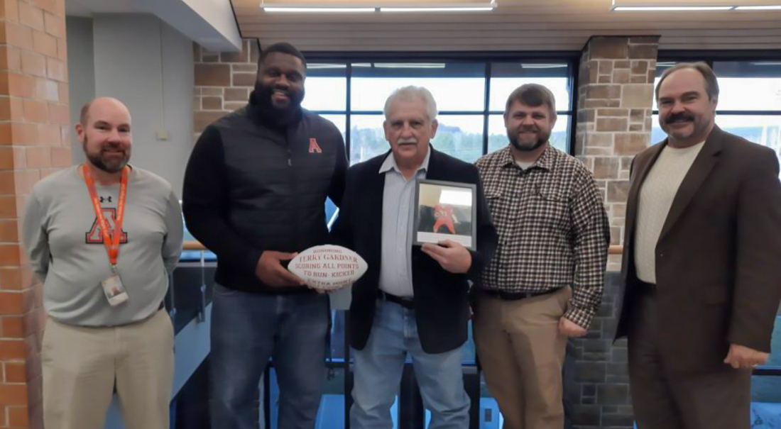 Terry Gardner, an Avery County High School Class of 1971 graduate, was presented a football by Avery Schools Superintendent Dr. Dan Brigman, Avery High head football coach Ethan Farmer, principal Ricky Ward and athletics director Jay Smith in recognition of his scoring all of the points in Avery’s first-ever football win, 7-6, over Morganton in 1970. Gardner played both running back and kicker on offense and linebacker on defense. He made a touchdown run and then kicked the extra point to lead the Vikings. Those achievements are listed on the football he was given.