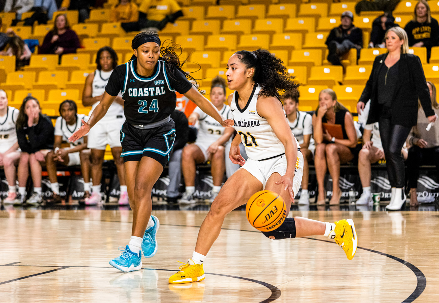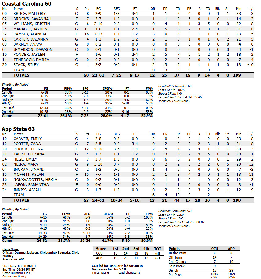 In the game’s critical moments at the end, it was senior point guard Eleyana Tafisi who provided a key play, drawing an offensive foul with just 12 seconds to play. Even still, Coastal Carolina couldn’t capitalize, the Chanticleers’ senior forward Jaylen Ponder unable to convert two free throws in the final seconds that likely would have tied the game at 62 and sent it into overtime. As it was, the Mountaineers’ Pericic was fouled after collecting the last free throw rebound and was fouled, upon which she made one of her final two shots from the charity stripe with six seconds remaining.