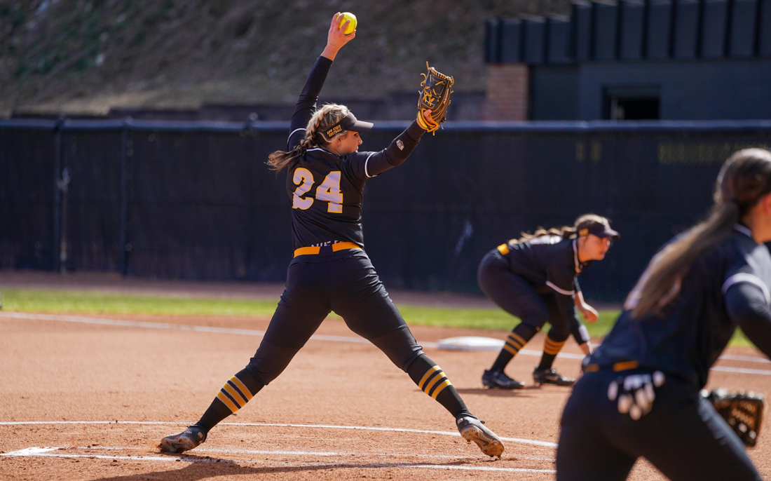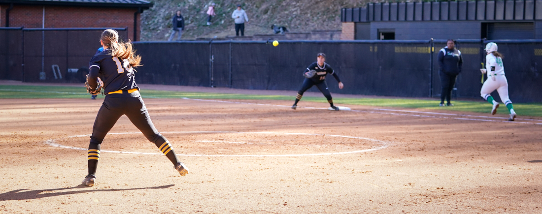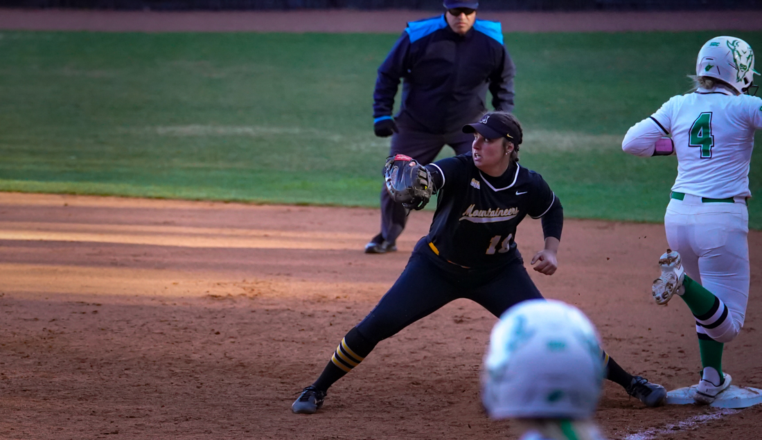 If it was even possible, the Mountaineer bats were colder than the 37-degree weather braved by an estimated crowd approaching 300 softball fans, including a large contingent of Marshall supporters. Because of Friday evening’s drenching rain, the originally scheduled 2 p.m. first pitch for the opener of league play (that also served as Parents Day for the Mountaineers) was moved to 4 p.m., to allow the outfield more time to dry out and become playable. With the late afternoon start, the field conditions may have been drier but the temperatures dropped precipitously as the game wore on. As a result, the second half of what was scheduled as a doubleheader was cancelled.