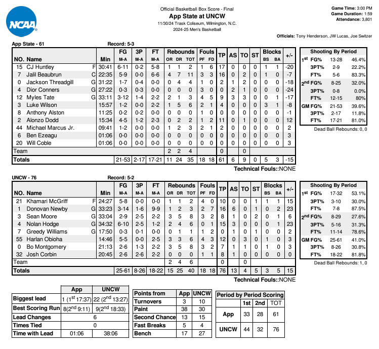 A Tate three at the 4:41 mark of the first half brought the Seahawks’ advantage back down to three, but the home team answered by scoring eight of the game’s next 10 points to take an 11-point lead into halftime. Huntley, Tate and Beaubrun accounted for 28 of App State’s 33 points in the first half. UNCW shot it well in the opening stanza, making 53 percent of their shot attempts while also grabbing seven offensive rebounds.