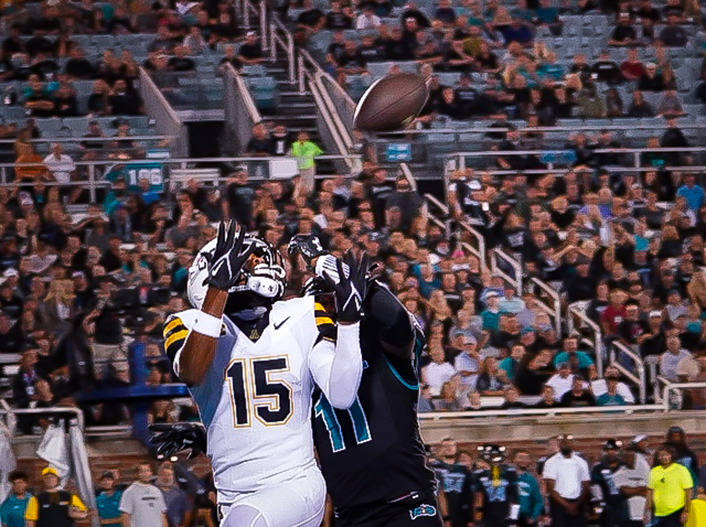 Suddenly, App State was down, 14-0, and the visitors’ fate seemed all but sealed when Aguilar & Co. could only move the ball 32 yards in four plays before coughing up a first interception. The ball was thrown slightly behind Jackson, bounced off his awkwardly outstretched hands and into the arms of Courtney Eubanks, CCU’s graduate student defensive back who transferred from FCS powerhouse North Dakota State after his junior year.