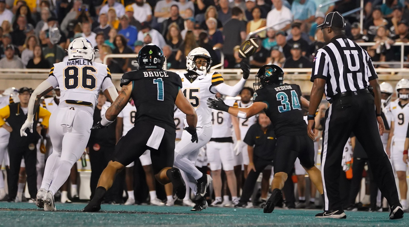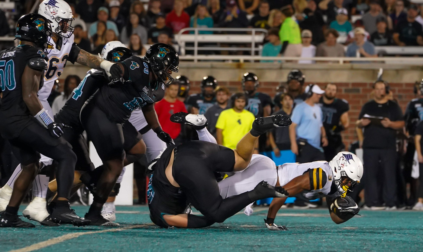 But this is where the Mountaineers’ night of post-Halloween turnover horrors began. Under pressure from an untouched linebacker, Clev Lubin, a redshirt sophomore transfer from Iowa Western Community College, Aguilar was technically sacked for a 21-yard loss and lost control of the football for a fumble before being able to get a pass off, the ball fluttering to the teal-hued turf. It was nearly a “scoop and scoot” by Coastal’s defensive lineman Naejaun Barber, but the redshirt junior transfer from South Carolina State could not keep his balance and sprawled to the ground.