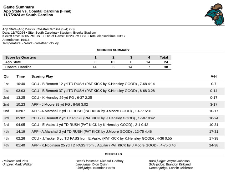 The Mountaineers did manage a 12-play, 75 yard drive early in the final stanza, but it also took almost five minutes off the game clock. The two Sun Belt Conference rivals traded touchdowns in the finals minutes, App State moving the ball 75 yards in four plays, highlighted by a 25-yard TD reception by Kaedin Robinson, but with only 1:40 left on the clock and down by 14 points. Vasko ran one play, then went into victory formation to run out the clock and seal the win for Coastal Carolina.
