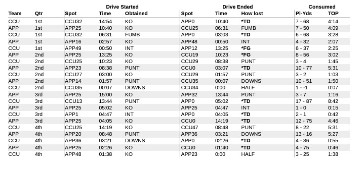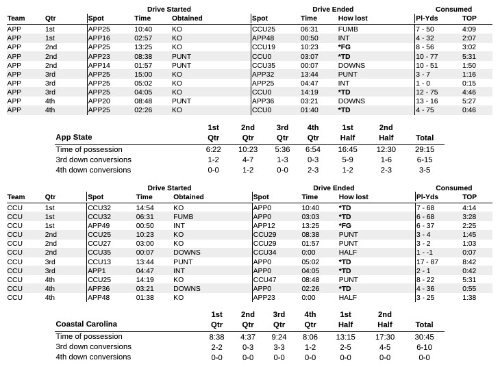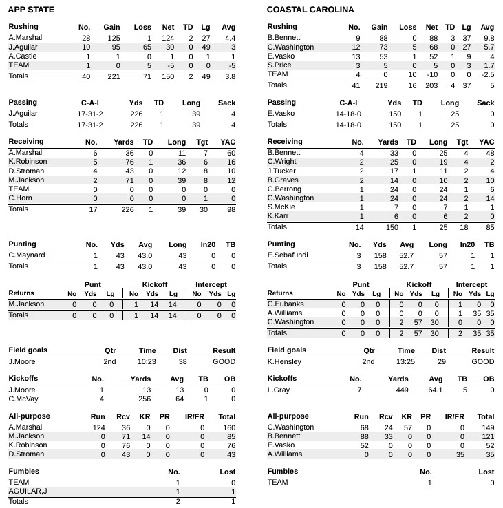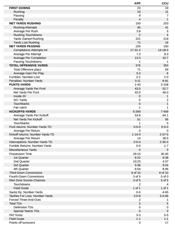 The time of possession was nearly identical, with App State having the ball 29:15, Coastal Carolina for 30:45. The Mountaineers edged the Chanticleers in total yards. 376-353.