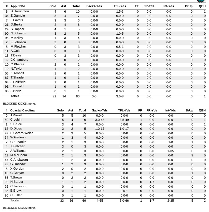 - App State’s defense held Coastal Carolina to just 353 total yards and 150 passing yards, but multiple turnovers by the Mountaineer offense gave the Chanticleers a short field.