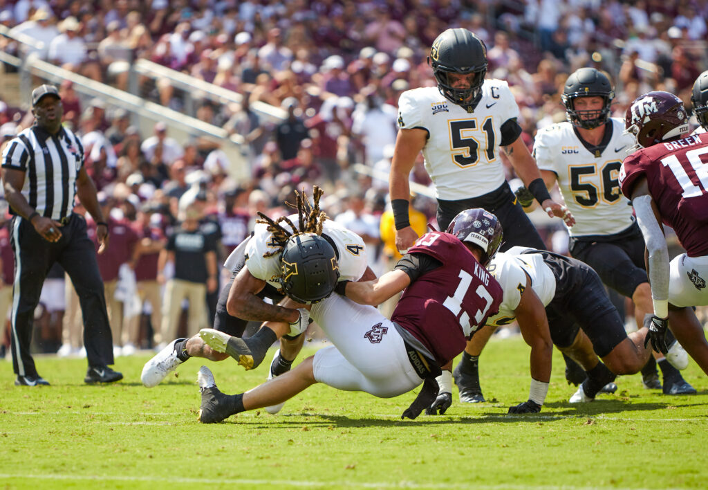 Running back Devon Achane accounted for both of the Aggies’ touchdowns, the first coming on a 26-yard run on the drive after Marshall’s TD. Then, after Mountaineer QB Chase Brice had flipped a short pass to tight end Henry Pearson on the right side that saw the 6-3, 245-lb. senior from New Jersey run around the perimeter and sneak one foot inside the goal line pylon, Achane responded with a 95-yard kickoff return, covering the distance virtually untouched.