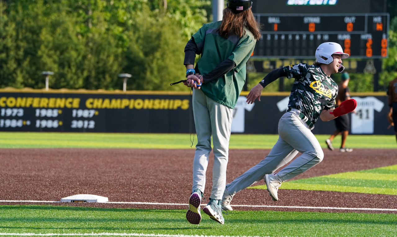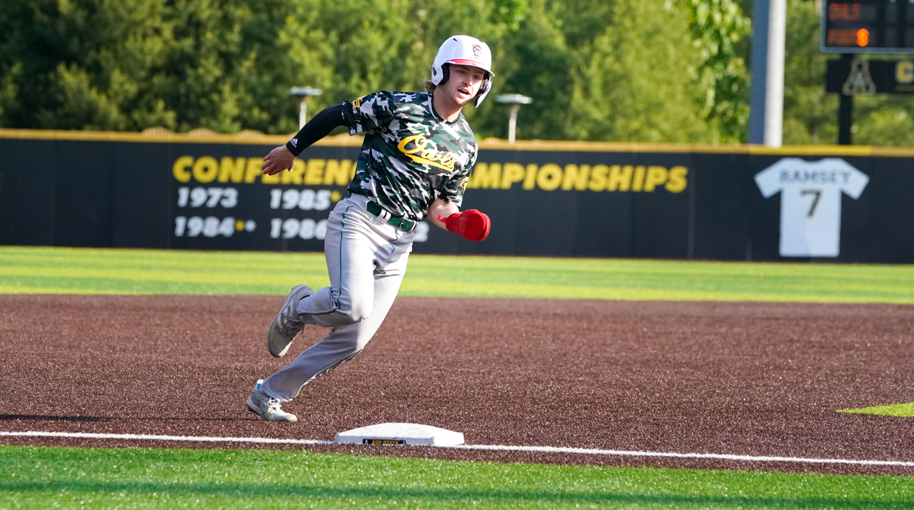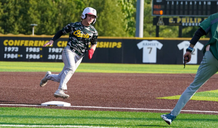 Two of the Owls’ nine doubles happened in the first inning, beginning with shortstop Matthew Heavner’s leadoff rip to the gap in left field. He plated the game’s first run of the evening just one batter later when Owl right fielder G. Allen singled, the speedy Heavner not pausing as he rounded third (see cover photo) and headed home, standing up. Allen later scored on third baseman Brady Jeffcoat’s double to left, accounting for the Owls’ second earned run of the opening frame.