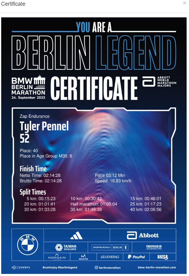 Pennel’s “PR” was set in the Chevron Houston Marathon this past January, in 2:12:16 where he finished No. 5 in a strong field. ZAP Endurance head coach said before this year’s Berlin race that Pennel and Izewski were both aiming for 2:11, perhaps lower.