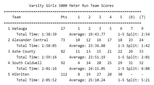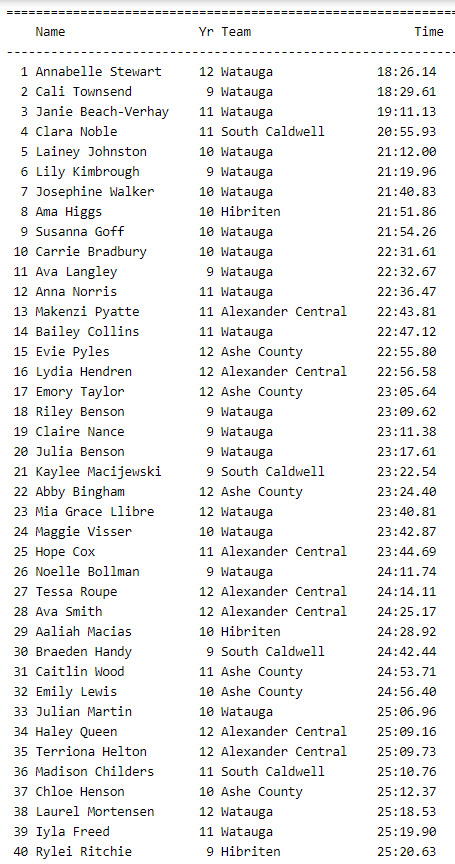 By David Rogers. LENOIR, N.C. — With a 1-2-3 sweep and eight of the top 10 finishing spots, Watauga’s women’s cross country team dominated the 3A/4A Northwestern Conference championships on Oct. 16 on the Lenoir Aquatic & Fitness Center course.