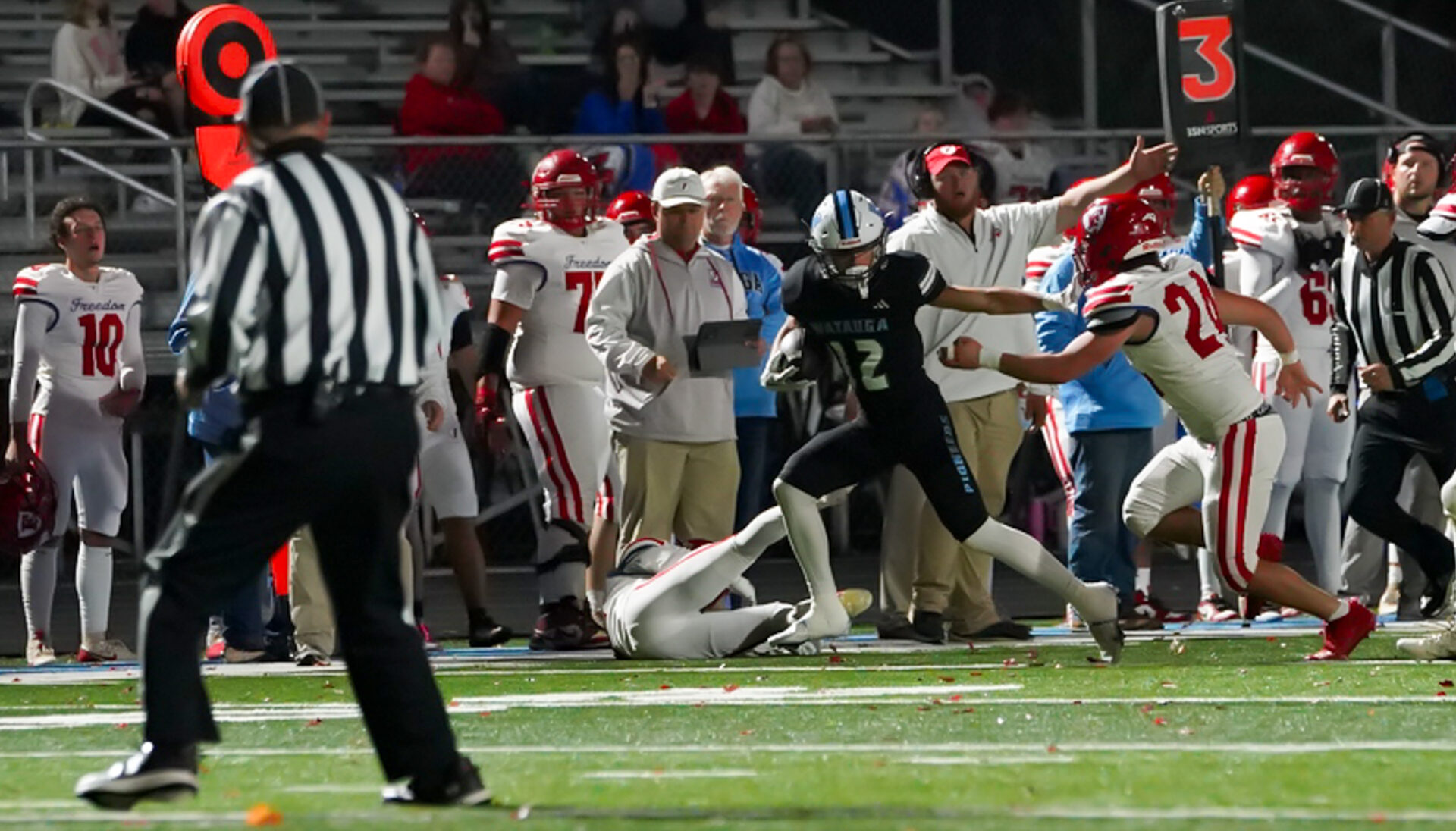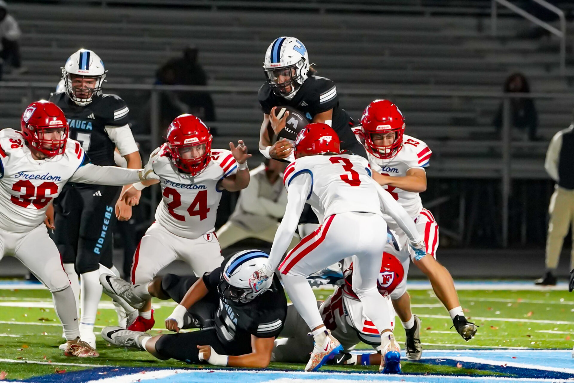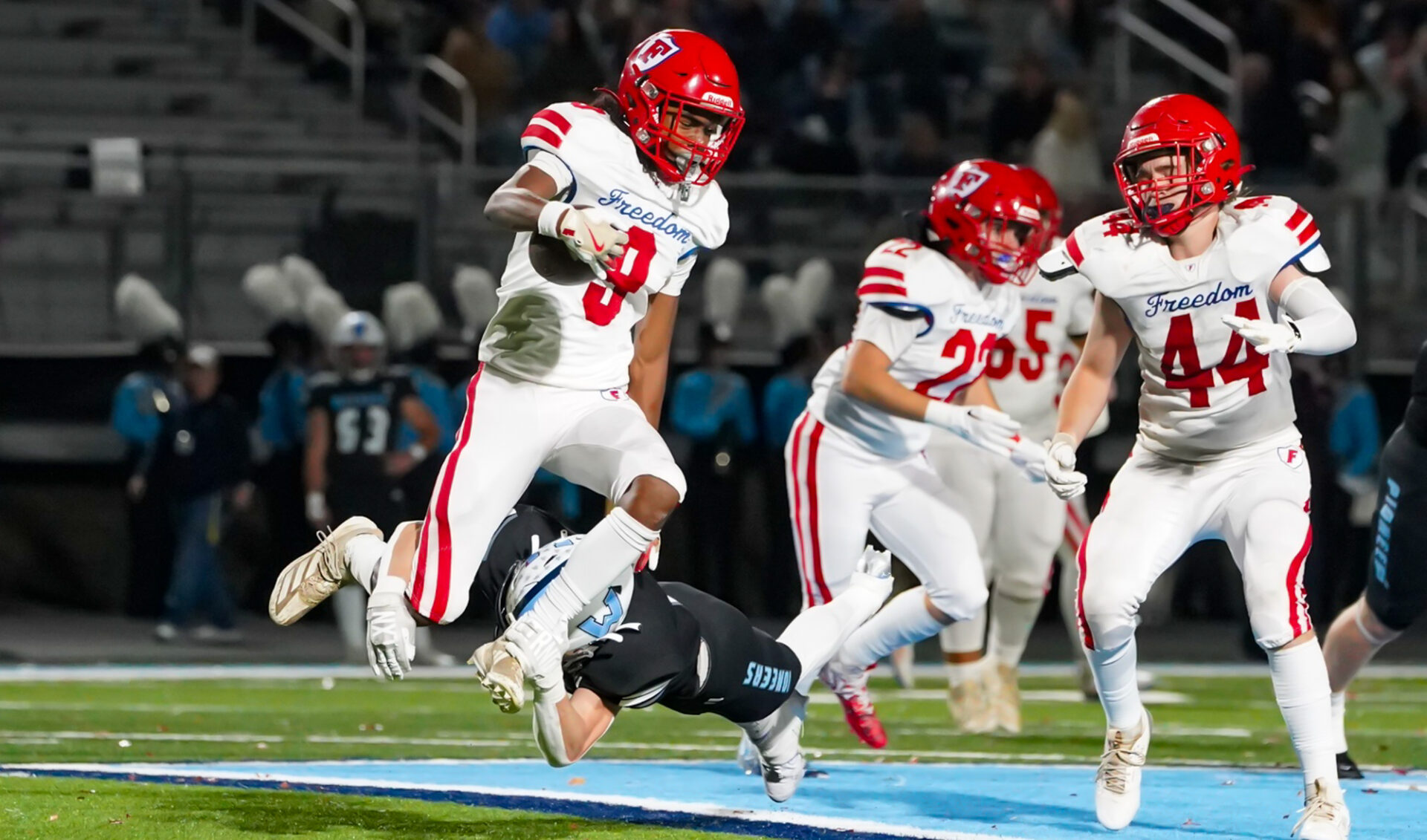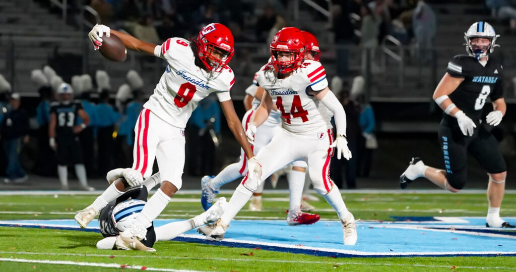 And what a way to celebrate Senior Night on the field, rolling up 338 yards of total offense while limiting the Patriots to just 111. On offense and special teams, Freedom fumbled the ball seven times, losing two of them, and threw one pass interception.